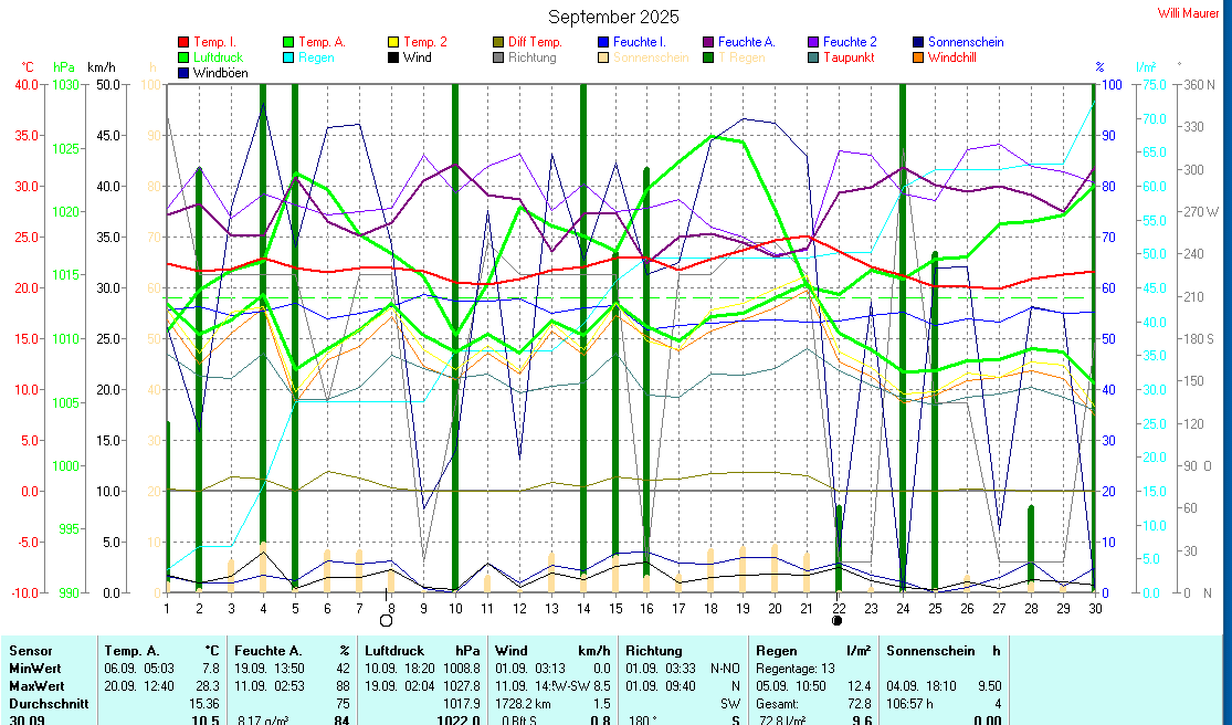 Die dargestellten Werte repräsentieren die Daten der letzten 24 Stunden! Der Luftdruck ist auf Meereshöhe bezogen! |