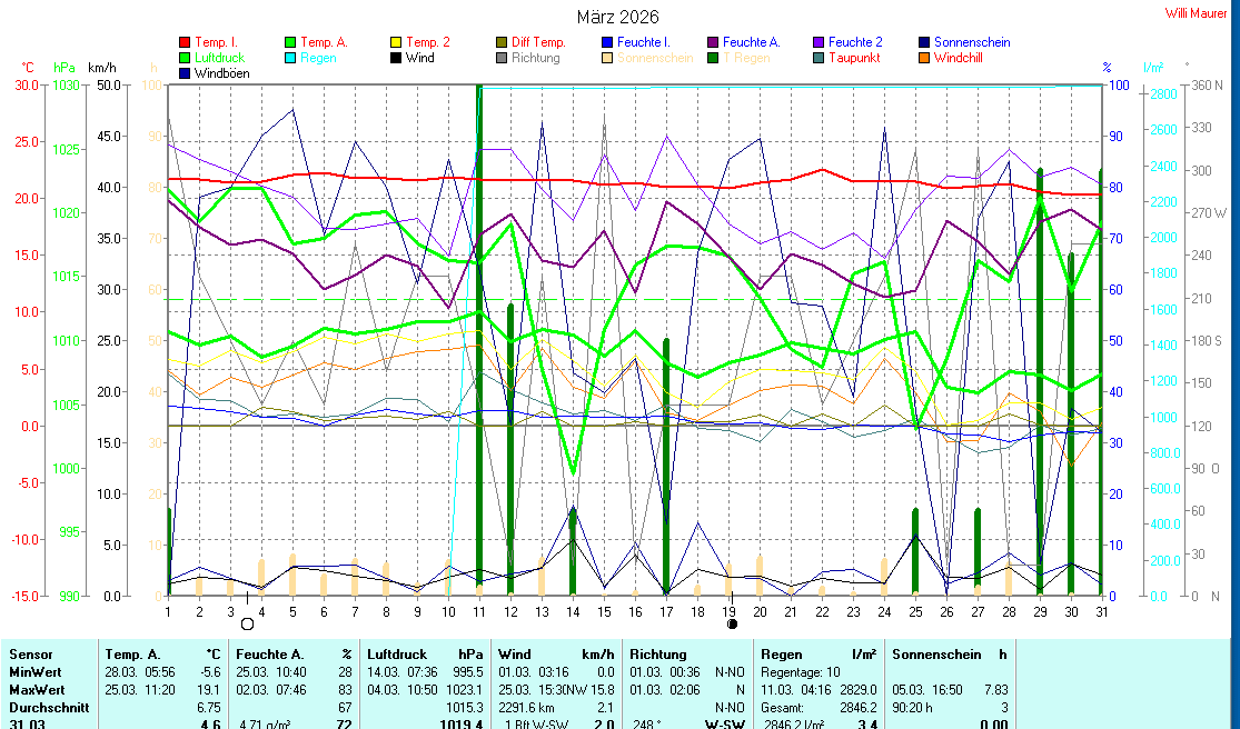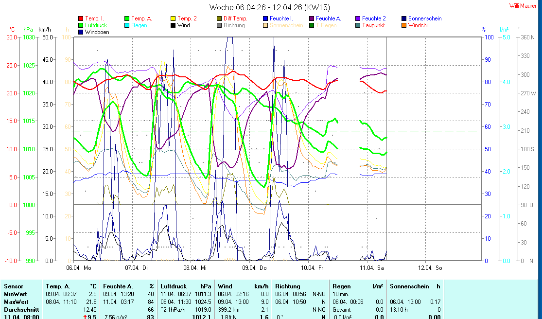 | Die dargestellten Werte repräsentieren die Daten der letzten 24 Stunden! Der Luftdruck ist auf Meereshöhe bezogen! |